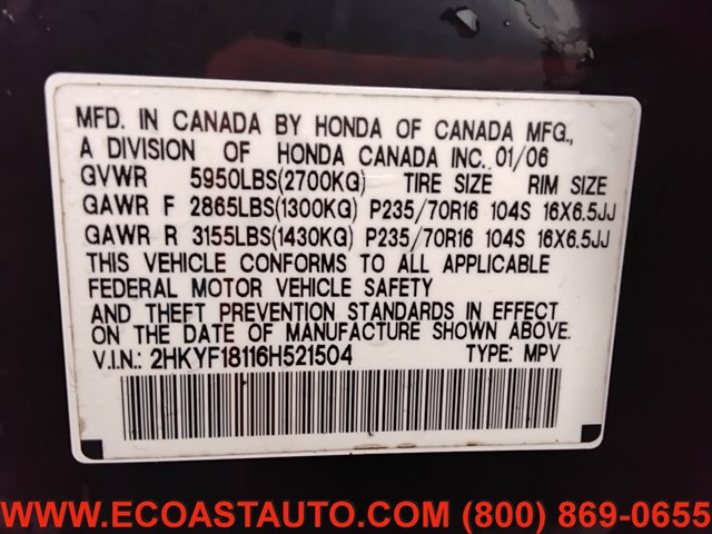 | VIN | 2HKYF18116H521504 |